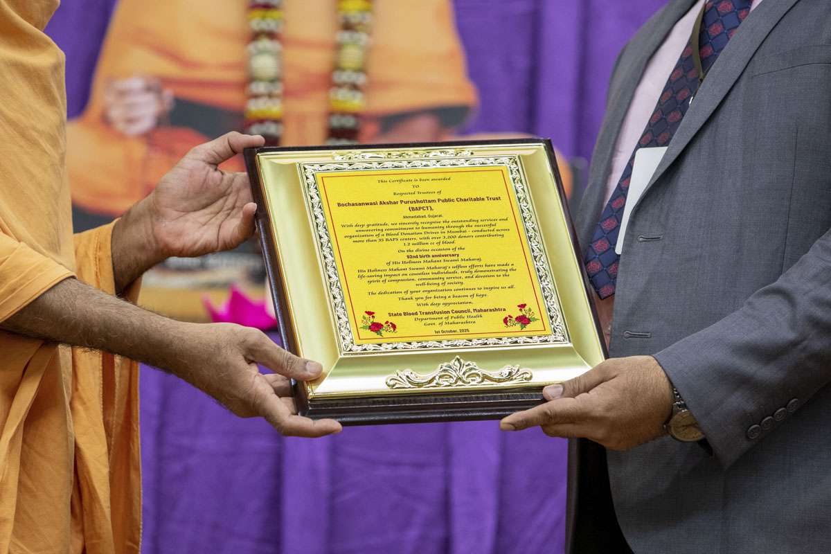 On this occasion, officials from the State Blood Transfusion Council (SBTC), on behalf of the Maharashtra State Health Department and the Honorable Health Minister, presented a letter of appreciation to BAPS for collecting more than 12 lakh cc of blood during the blood donation camp held on the occasion of Mahant Swami Maharaj’s 92nd birth anniversary in September.